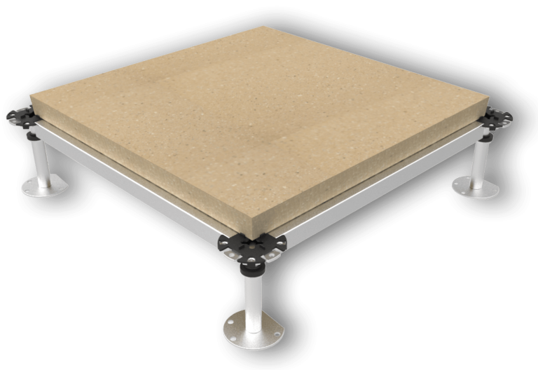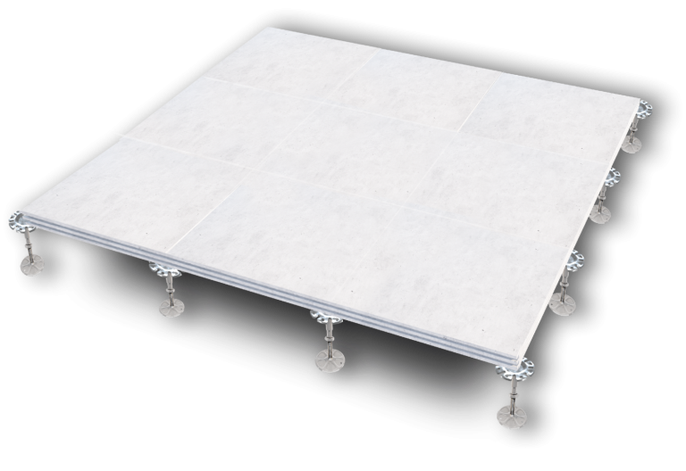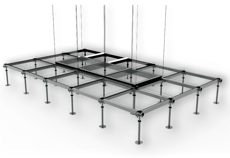 Diese Platten liegen auf Doppelbodenstützen aus Stahl auf. Die Stützen können an ihren Köpfen durch Rasterstäbe oder C-Profile miteinander verbunden sein.