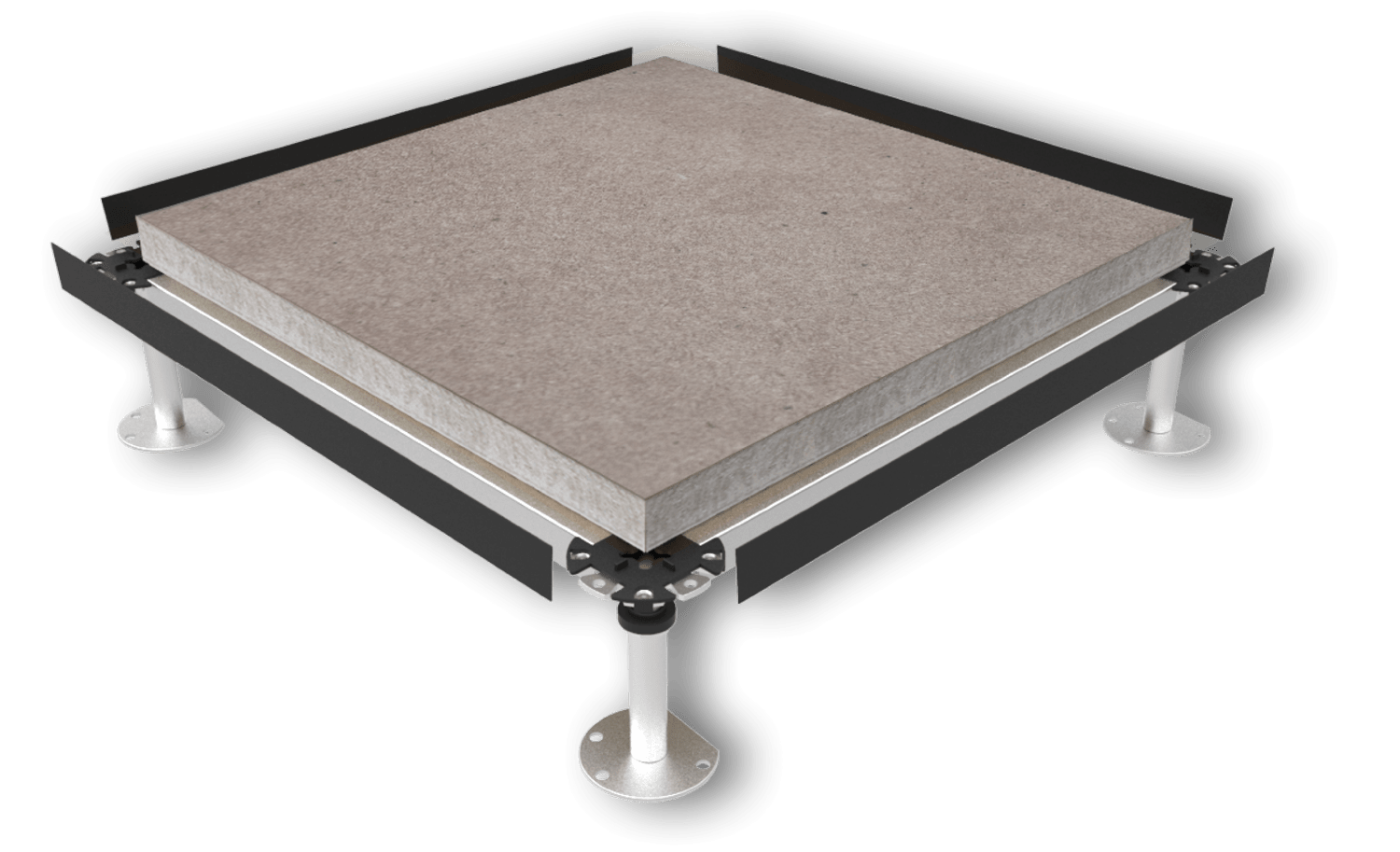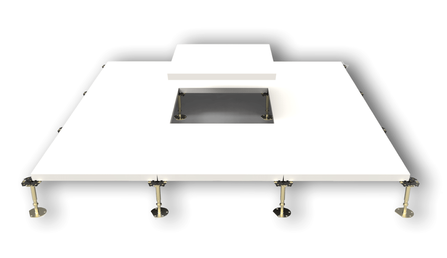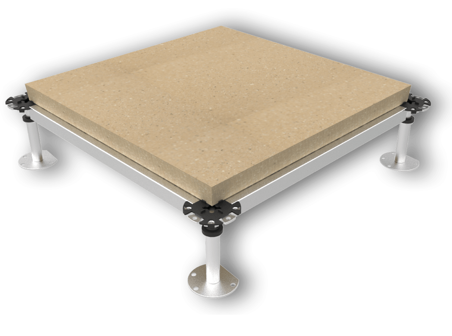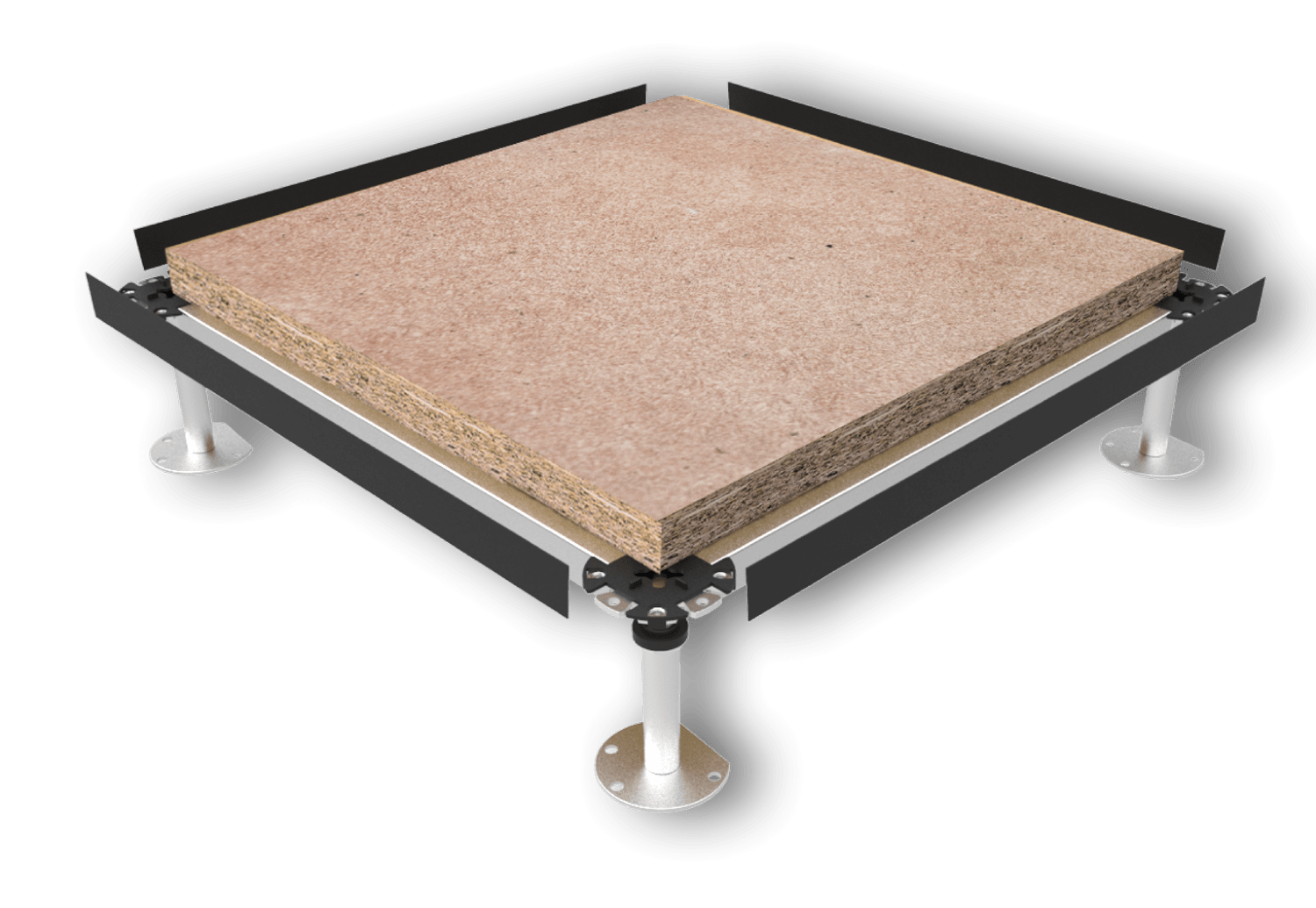 Je nach Last- und Feuchtigkeitsanforderungen kann die Unterseite mit einem Alu-Feinblech oder verzinktem Stahlblech beschichtet werden. Die Kanten sind mit Spezialumleimer versehen. Die Unterkonstruktion wird aus höhenverstellbaren, auf den Rohboden verklebten Ganzstahlstützen hergestellt. Durch die einheitliche Größe von 600 x 600 mm sind alle Doppelbodenplatten untereinander austauschbar. Der einfache und jederzeit mögliche Zugang zu den Installationen beim Doppelboden ermöglicht eine hohe Flexibilität und erlaubt eine unbegrenzte Änderung der Bodenkonfiguration.